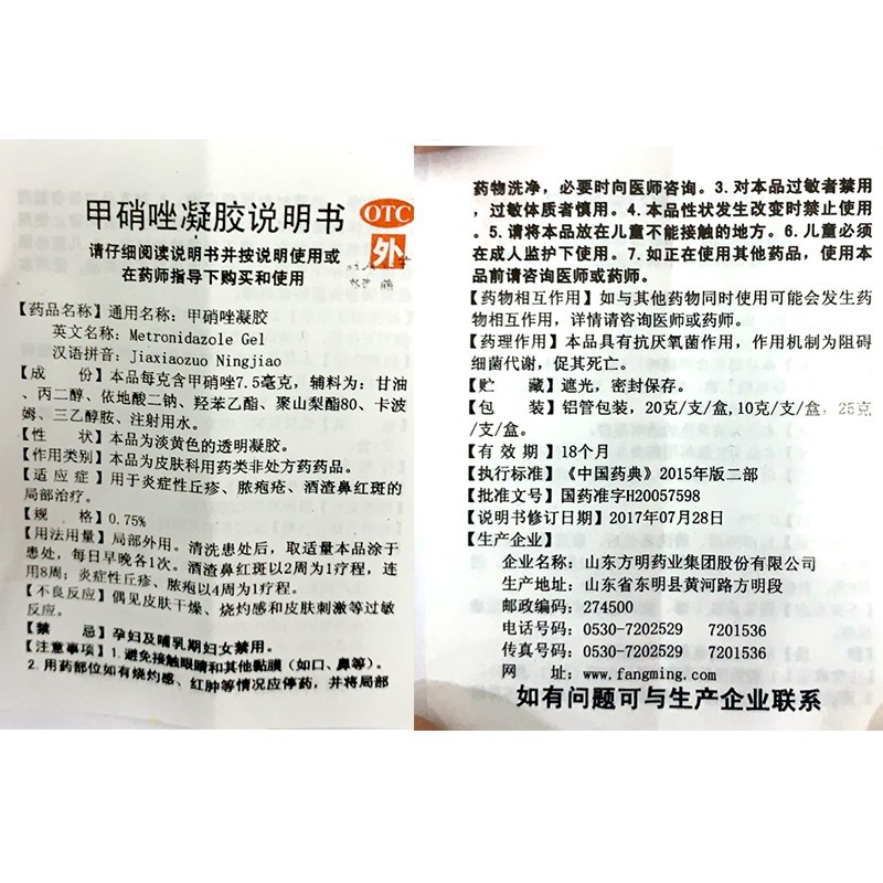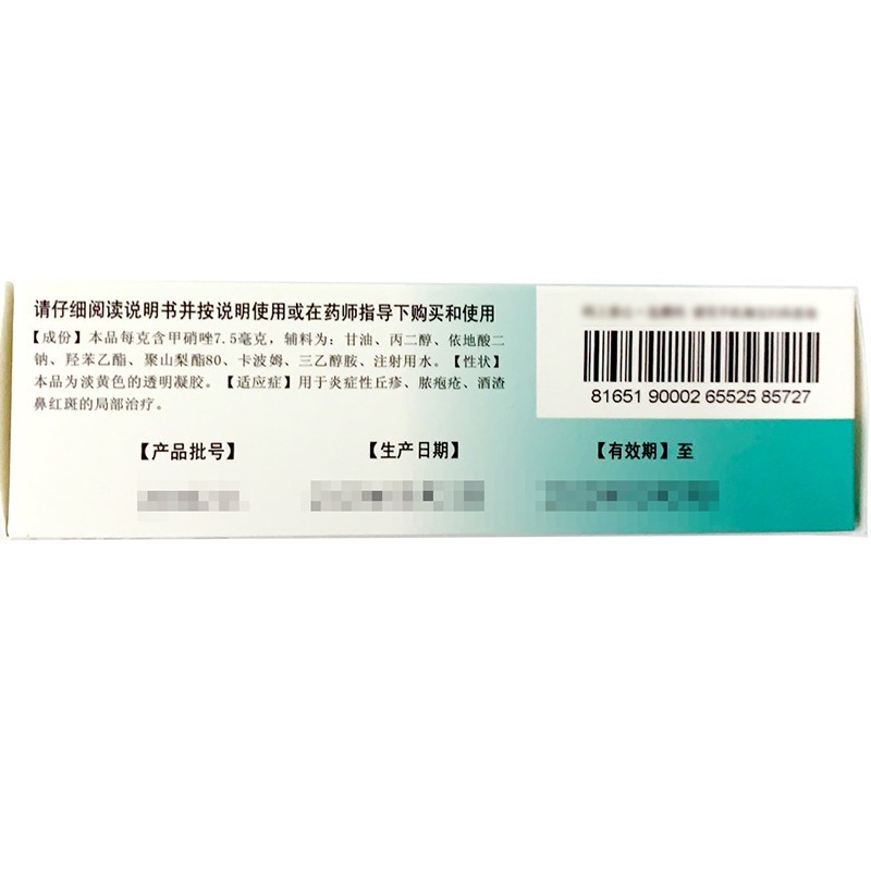 本品每克含主要成份为甲硝唑7.5毫克,辅料为:卡波姆、丙二醇、聚山梨酯80、20%葡萄糖酸氯己定液、氢氧化钠、纯化水。