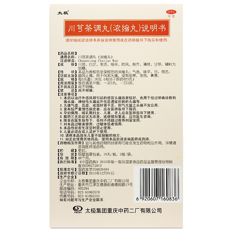 1.本药以治疗外感风邪引起的感冒头痛效果较好,也用于经过明确诊断的偏头痛、神经性头痛或外伤后遗症所致的头痛等。 2.久痛气虚、血虚,或因肝肾不足,阳气亢盛之头痛不宜应用。 3.素有较严重慢性病史者,应在医师指导下服药。 4.孕妇慎用。哺乳期妇女、儿童、老人应在医师指导下使用。 5.服药三天后症状无改善,或病情加重者,应向医生咨询。 6.除非在医生指导下,否则不得超过推荐剂量使用。 7.对本品过敏者禁用,过敏体质者慎用。 8.本品性状发生改变时禁止使用。 9.儿童必须在成人监护下使用。 10.请将本品放在儿童不能接触的地方。 11.如正在使用其他药品,使用本品前请咨询医师或药师。